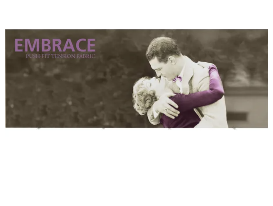 The Embrace? 20ft wide full height (8 Quad x 3 Quad) fabric display is sleek, collapsible and portable. The kit is comprised of two white collapsible 4×3 frames, channel bars that hold the push-fit fabric graphic, and one large, seamless push-fit fabric graphic offered with or without endcaps, single or double sided. No tools are required for assembly. The lightweight and highly portable display packs away as easily as it sets up for the ideal tradeshow, event or retail display!