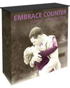 Embraceā„¢ Counter is a sleek, collapsible push-fit tension fabric counter that delivers style with minimal effort. The Embrace Counter pairs a collapsible, white frame and channel bars that hold push-fit SEG fabric graphics. A white internal shelf provides additional storage space. The counter is finished with a laminated counter top for a sleek appearance. Embrace Counter requires no tools for assembly, is lightweight and highly portable. It packs away as easy as it sets up!