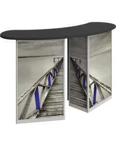Combining durable, lightweight extrusion with printed graphic panels, Linear? Double Reception Counter features two rectangular counters connected with an arching countertop, locking storage cabinets and internal shelving.
