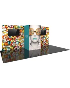 The 10ft x 20ft inline Vector Frame? Kit 27 is a symmetrical modular exhibit that offers accessible storage, lots of area for messaging and branding and digital promotion! Extrusion frames are coupled with push-fit SEG graphics to create a sleek, seamless appearance. Closet features a ample storage and the kit includes two medium monitor mounts to hang TVs or LCD screens.