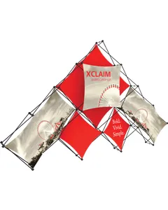 Xclaim 14ft wide 10 Quad Pyramid Kit 01 is a versatile stretch fabric popup display. Add dimension to your event or tradeshow with unique, exciting graphic styles. Xclaim 10 Quad Pyramid Kit 01 is easy to setup, lightweight and portable. The collapsible popup frame is fully magnetic (with magnetic linking connectors), making it simple to assemble and disassemble. Stretch fabric graphics come pre-attached to the frame, making assembly easy and fast. Graphics adhere to the hubs using push-fit attachment technology. Xclaim 10 Quad Pyramid Kit 01 comes with graphics, frame and soft case with a shoulder strap.